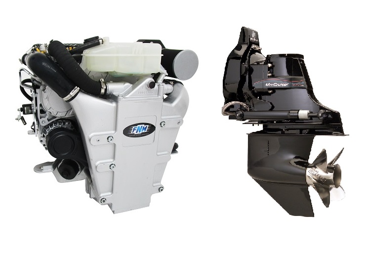Brand new crated FNM 20HPEP-180 180hp Four Cylinder Heat Exchanger Cooled Marine Diesel Engine Package With Mercruiser Bravo 1 Sterndrive, Transom Shield Assembly, Trim Pump, Control Panel, Wiring Harness, Water Cooled Exhaust Elbow, Flexible Engine Mountings & 12V Electrical System